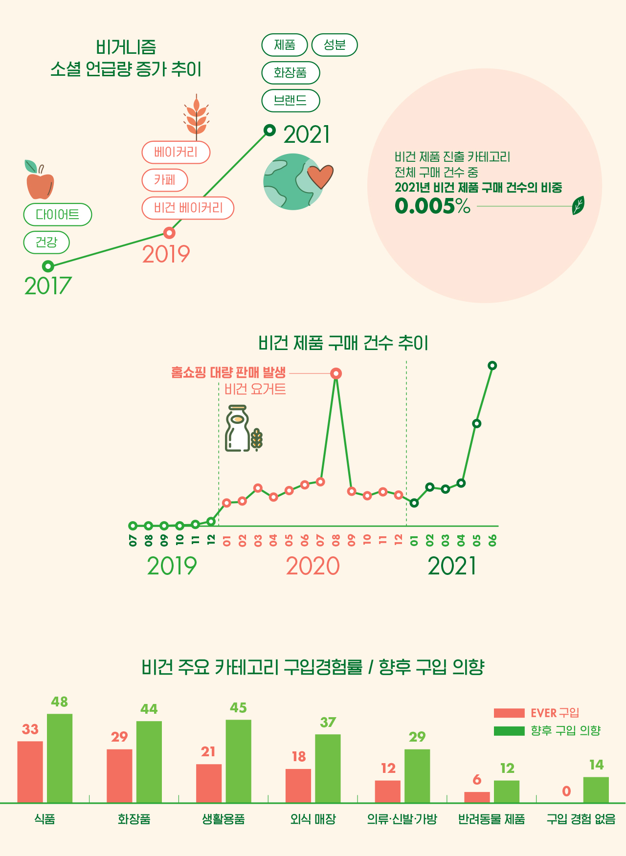 관심도의 성장에 따라 비건 제품 구매도 증가했다. 롯데멤버스 구매 데이터에 따르면 비건 관련 제품의 구매 건수는 2019년 말을 기점으로 폭발적으로 증가하고 있다. 또한 유통되는 비건 제품의 카테고리 개수 또한 2018년 1개에 그쳤으나 2020년 이후 30개 이상의 카테고리로 확대되며 일상 곳곳에서 비건 제품이 스며들고 있음을 보여준다. 이렇게 높은 관심도에도 불구하고 아직 시장 규모 자체는 걸음마 단계다. 비건 제품이 출시된 카테고리를 전체로 봤을 때 비건 제품 구매 건수는 전체의 약 0.005%에 불과하다. 높은 관심도에 비해 아직까지는 구매가 많이 일어나지 않는 것이다.