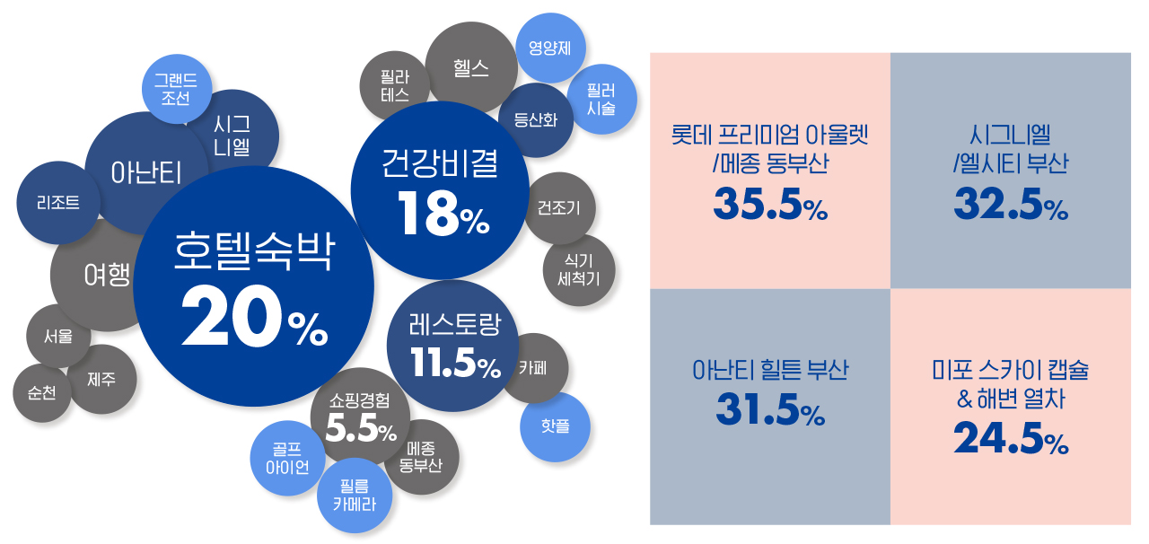 호캉스는 더 이상 MZ만의 전유물이 아니다. WAVY가 최근 3개월간의 소비 경험 중 지인에게 가장 추천하고 싶은 것으로 호텔 숙박(20%)이 가장 높은 응답률을 보였다. 특히 최근 1년 내에 방문한 부산 내 핫플레이스 순위(중복 응답)는 롯데 프리미엄 아울렛/메종 동부산(35.5%) > 시그니엘/엘시티 부산(32.5%) > 아난티 힐튼 부산(31.5%) 순으로 나타났다. 모든 응답자의 거주지가 부산임을 고려하면 WAVY에게 고급 호텔과 프라이빗 리조트는 단순히 잠을 자는 숙박지를 넘어 시간을 가치 있게 향유하는 경험지로 자리 잡았음을 알 수 있다.