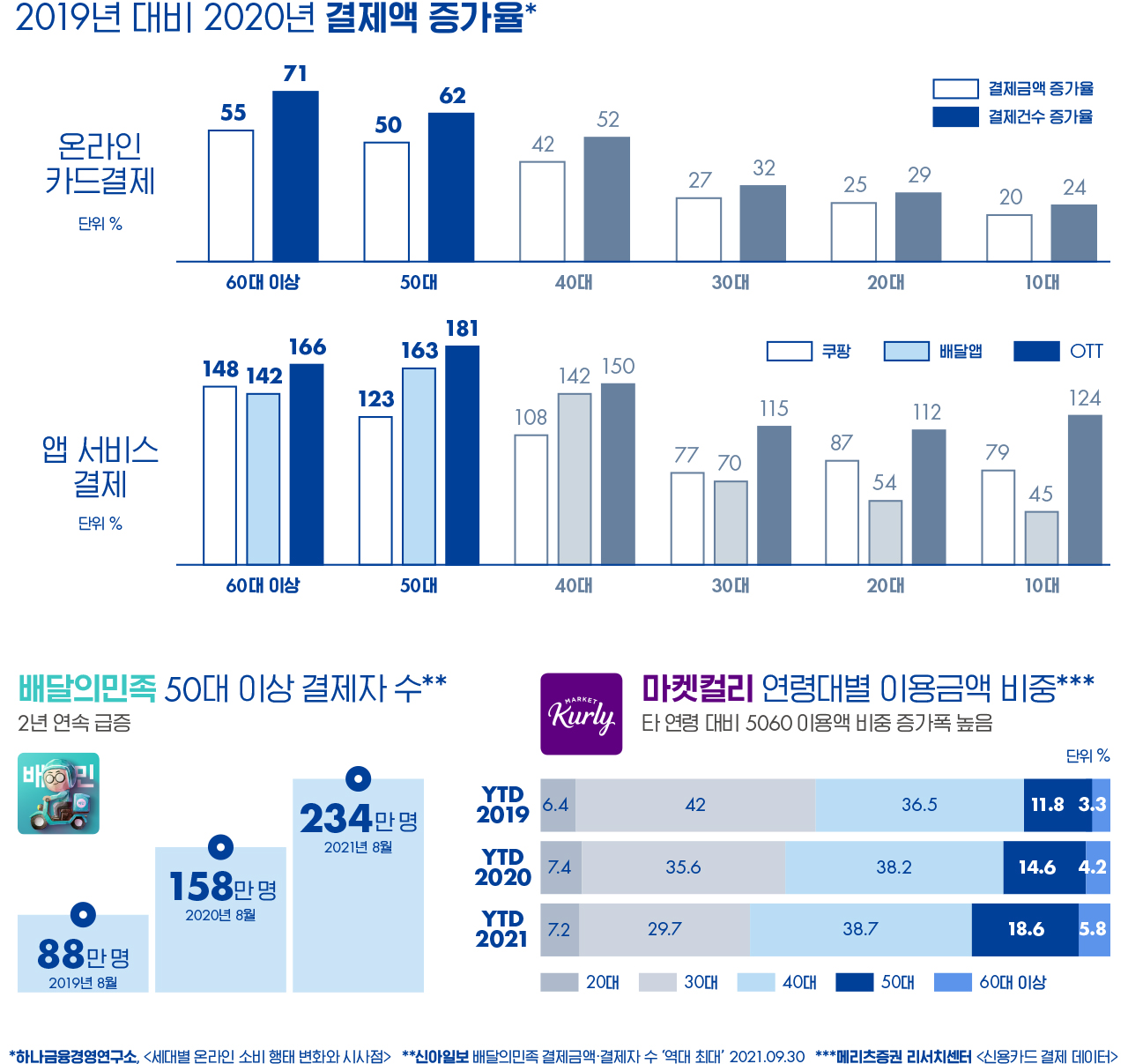 新5060의 마켓 파워는 전 세계적으로 다양한 분야에서 두각을 나타내고 있다. 국내에서는 특히 2019년 대비 2020년, 50세 이상 세대의 온라인 앱 이용 및 결제액 규모가 타 연령층 대비 폭증했다는 사실이 여러 지표에서 드러났다.