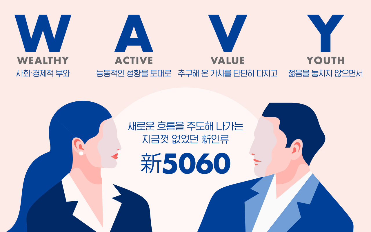 살펴본 것처럼 新5060 WAVY는 새로운 물결을 일으키며 전에 없던 소비지형을 그려 나가고 있다. 글을 마무리하며 WAVY를 이해하는 데 도움이 될 5가지 핵심 키워드를 제시한다. 강력한 마켓 파워를 지닌 새로운 타깃이나 비즈니스 성장을 위한 돌파구를 찾고 있다면 이제 WAVY에 주목해 보자.