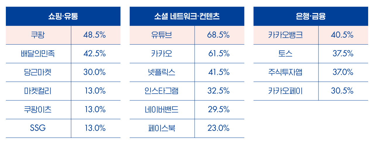 WAVY의 높은 앱 이용률도 이들의 막강한 디지털 마켓 영향력을 보여준다. 주 1회 이상 사용하는 앱 응답 결과를 보면 MZ 못지않게 배달/SNS/OTT 관련 앱을 활발히 이용함을 알 수 있다. WAVY가 맥북과 아이폰 구매 첫 세대였으며 Lycos, Daum, Yahoo 등 인터넷 시대의 프론티어였음을 상기시키는 결과다.