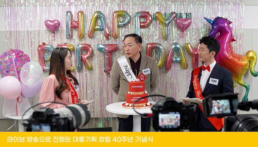 창립 40주년 기념식은 라이브 방송으로 진행됐습니다. 주니어 직원들이 대홍의 과거 문화를 만나는 ‘그때 그 대홍’ 인터뷰, 역대 대표이사들의 덕담 및 연예인의 축전 영상, 추억의 사진 응모 이벤트까지 과거와 현재를 아우르는 흥미로운 컨텐츠가 가득했습니다. 특히 대홍 추억 사진 이벤트는 재미있는 스토리가 담긴 사진이 다수 소개돼 임직원에게 큰 웃음을 선사했습니다.