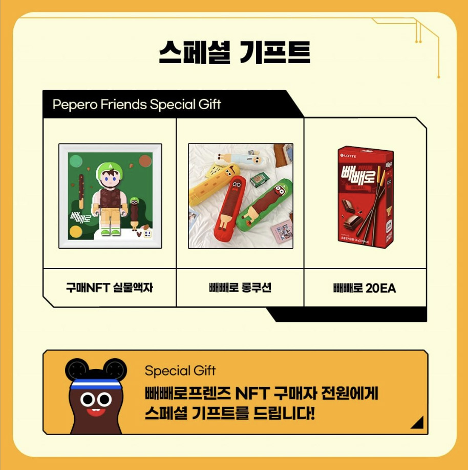빼빼로프렌즈 NFT를 최초 구매한 사람들에게는 빼빼로프렌즈 롱쿠션(굿즈)과 빼빼로 과자 20개, 그리고 NFT 탁상용 액자가 스페셜 기프트로 제공됐습니다. 그리고 NFT를 통해 발생한 수익금은 2013년부터 꾸준히 진행하고 있는 빼빼로의 대표적인 사회공헌사업인 ‘스위트홈’에 전액 기부될 계획입니다. 마음을 나누는 안부의 매개체로써 오랜 시간 받은 사랑을 더 많은 이웃에게 나누는 빼빼로! 앞으로 더 재미있고 신선한 캠페인을 만들어갈 롯데제과와 빼빼로에 많은 관심과 응원 부탁드립니다.