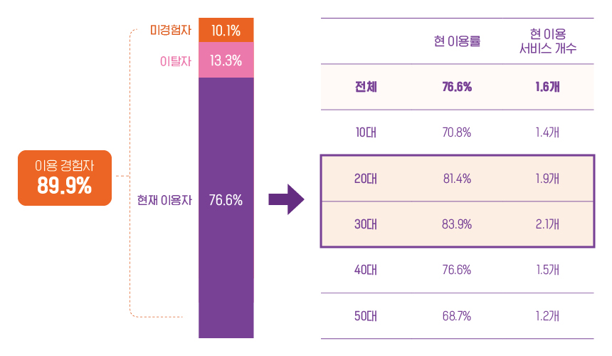 남녀노소를 막론하고 OTT 서비스를 구독하는 시대이지만 주된 소비층은 단연 MZ세대다. 설문조사(출처: 오픈서베이 OTT 서비스 트렌드 리포트 2022)에서 20대와 30대 80% 이상이 OTT 서비스를 이용한다는 응답으로 다른 세대보다 높은 이용률을 보였다. 이용 서비스 개수도 20대가 1.9개, 30대가 2.1개로 역시 다른 세대보다 많은 플랫폼을 구독하는 것으로 드러났다. 대부분의 OTT 서비스 이용률 면에서도 20대와 30대가 단연 앞선다. 현재 OTT 서비스를 통한 IP 콘텐츠 소비를 MZ세대가 주도하고 있다 해도 과언이 아니다.