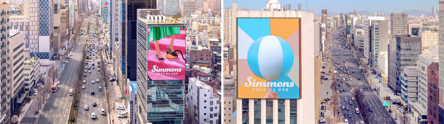 도산대로 1.6km 일대의 대형 옥외 디지털 빌보드에 동시다발적으로 총 8편의 디지털 아트를 전시한 캠페인은 여타 브랜드에서 극히 드문 사례로 이목을 끌었다. 온오프라인을 아우르며 대대적인 브랜드 캠페인을 펼치고 있는 시몬스는 ‘침대 없는 침대 광고’의 브랜딩 혁신을 이어가는 중이다.