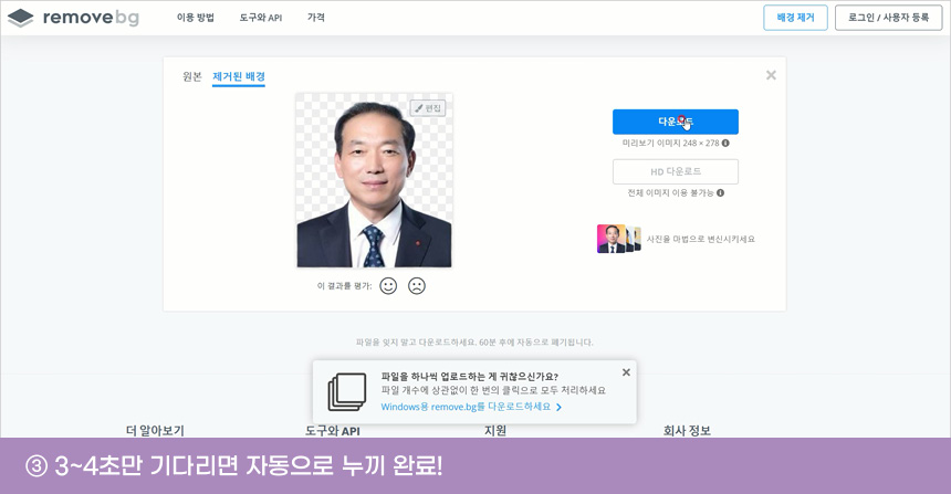 귀찮은 누끼 작업, 간단하고 빠르게 할 수 있는 사이트가 있다. ‘리무브bg’는 단 몇 초만에 사진 배경을 지워준다. 인물이나 제품 사진을 PPT에 깔끔하게 넣고 싶을 때 활용하면 좋다. 단, 작업 결과물을 고화질로 다운로드하려면 유료 결제해야 한다.