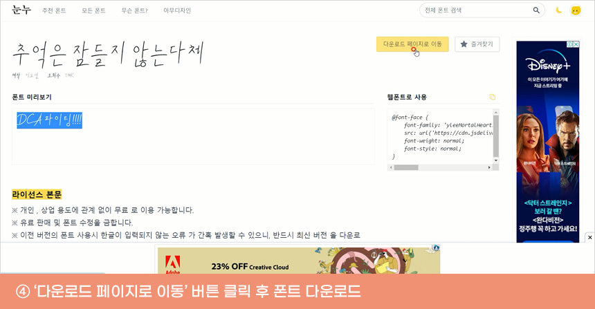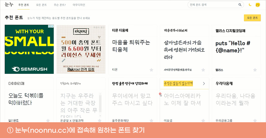 글씨체에 따라 PPT의 분위기, 주목도는 확 달라지는 법. 그렇다고 아무 거나 사용할 순 없다. 폰트도 엄연히 저작권이 있기 때문에 라이선스를 먼저 확인하자. ‘눈누’에서는 무료 폰트를 다운로드할 수 있고 저작권 관련 정보도 손쉽게 챙길 수 있다.