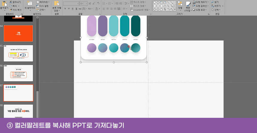 PPT 완성도를 좌우하는 색감. 내용이 아무리 충실하더라도 시각적으로 촌스럽게 느껴진다면 마음을 사로잡기 어렵다. 기본색을 벗어나 더 다양하고 세련된 색 조합을 원한다면 ‘핀터레스트’에서 컬러팔레트를 찾아보자. 잘 어울리는 색끼리 구성돼 있어 활용하기 쉽다.