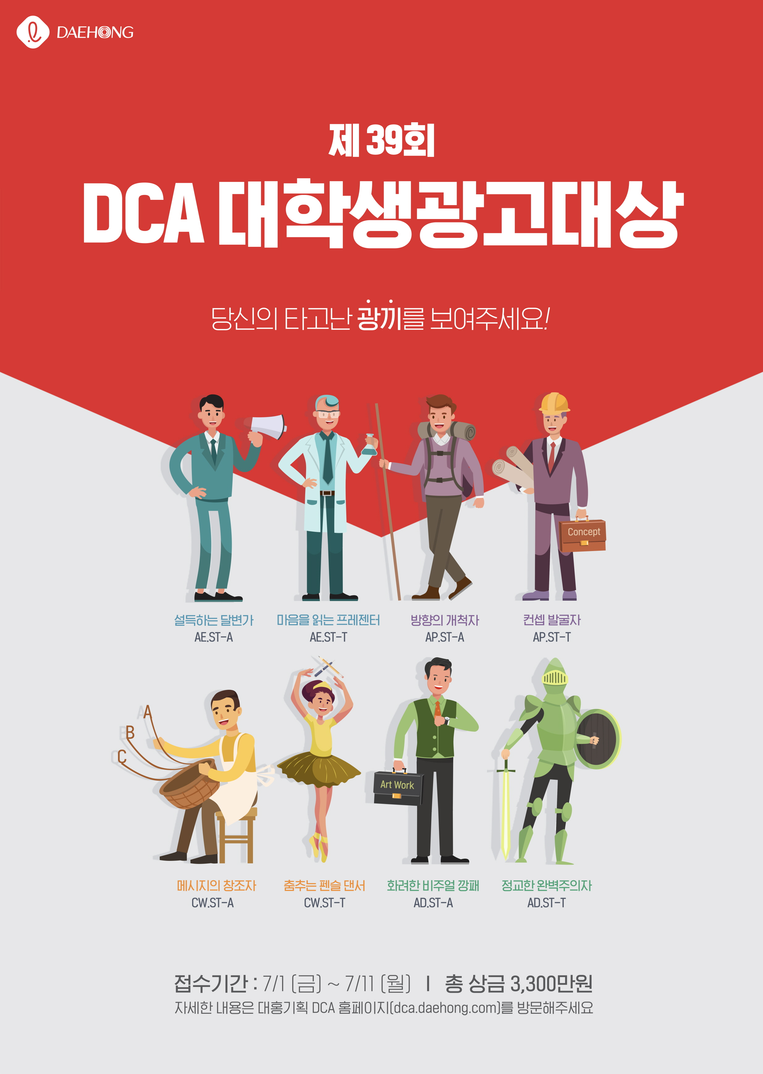 대홍기획이 제39회 <DCA 대학생광고대상>을 개최한다. <DCA 대학생광고대상>은 1984년 제정되어 광고인을 꿈꾸는 대학생들의 크리에이티브를 겨루고 예비 광고인을 육성하는 국내 대표적 대학생 광고 공모전이다.