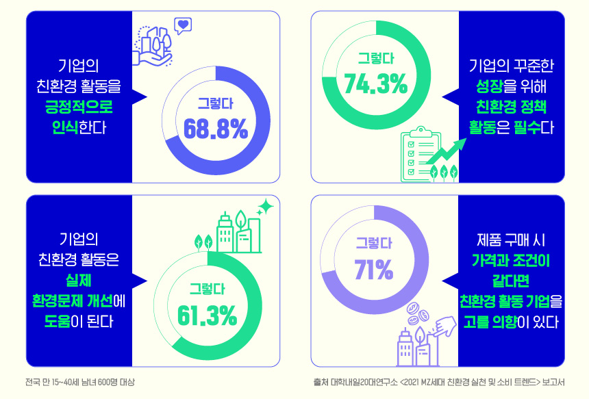 다시 말하면 MZ세대는 기후위기 문제를 해결해야 한다고 생각하지만, 거대한 전환을 바라지는 않는다. 비판적인 태도를 가지지만 결코 맞서 싸우지 않는다. 오히려 투쟁하지 않고 얻어낼 수 있는 결과에 관심이 있다. 환경문제에 관심을 갖는 MZ세대가 친환경 활동을 하는 기업에 호의적인 이유다. 대학내일20대연구소의 조사 결과에 따르면 MZ세대의 68.8%는 기업의 친환경 정책을 긍정적으로 본다. 다른 조건이 같다면 친환경 활동 기업의 제품이나 서비스를 구매하겠다는 응답도 71%에 달한다.