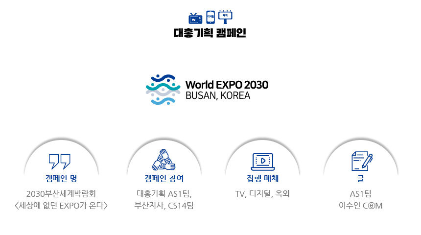 지금까지 월드컵과 올림픽, 월드엑스포를 모두 개최한 나라는 6개국에 불과합니다(프랑스, 미국, 캐나다, 일본, 독일, 이탈리아). 2030세계박람회를 부산에 유치하게 되면 대한민국은 세계 3대 행사를 모두 치른 나라가 되어 국가의 위상이 높아지고 엄청난 경제적 효과도 얻을 수 있게 되는 것이죠. 이렇듯 월드엑스포의 성공적인 유치를 위해 국민들의 적극적인 관심과 지지를 받을 수 있는 캠페인에 대한 고민이 시작됐습니다.