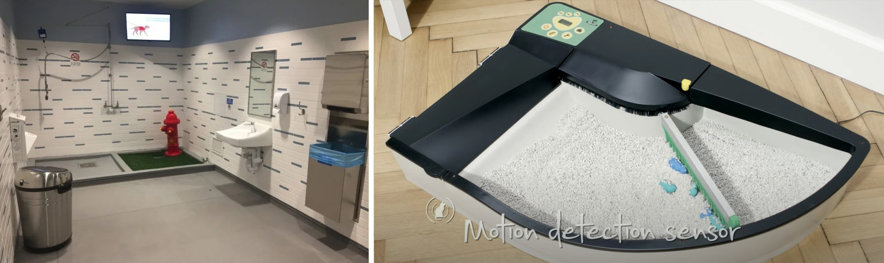 댕냥이를 위한 화장실 또한 산업의 범주로 올라선지 오래다. 개는 비교적 단순해 보이지만 나름 특별한 선호 체계를 가진다. 산책을 즐기는 견공들은 화장실을 들고 다닐 수 없기에 야외에서 생리적 욕구를 해결해야 한다. 이를 위해 산책하는 개에게 화장실을 제공하고 그 과정에서 비뇨기 계통의 건강문제를 체크해주는 개 전용 공중화장실이 등장하고 있다. 물론 해외 대부분의 공항에 있는 여행하는 개들을 위한 화장실은 이미 고전적 이야기다.
