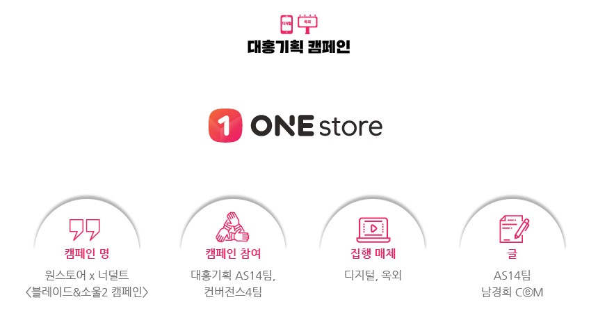 원스토어는 광고와 프로모션을 통해 모바일 게임 유저들과의 관계를 형성하고 즐거움을 제공하기 위해 노력해왔습니다. 같은 게임도 더 비싸게, 쿠폰 하나 없이 시작하던 기존의 플레이 방식에 집중해 지난 5월에는 모바일 게임을 색다르게 즐기는 비밀 조직 ‘원스맨’ 세계관을 접목했습니다. 오직 원스토어 이용자만이 누릴 수 있는 단독 혜택의 중요성을 다이내믹하고 재미있게 표현한 광고와 프로모션을 펼쳤죠. 그리고 이번 캠페인에서는 NC소프트의 <블레이드&소울2> 1주년 업데이트와 원스토어 입점을 기념하는 동시에 원스토어만이 제공할 수 있는 재미를 전달해 고객과의 유대감을 강화하고자 했습니다.