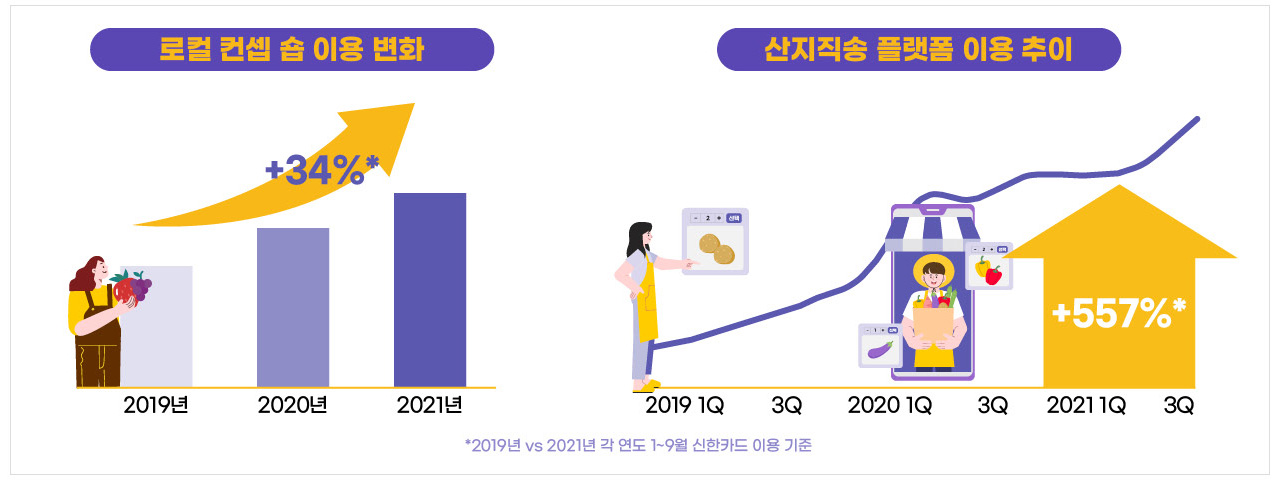 2021년 1월부터 9월 사이, 해당 지역에서만 구할 수 있는 식재료나 특정 지역의 유명 식당에서만 파는 음식을 직배송해주는 산지 직송 플랫폼 이용 횟수는 2020년과 비교했을 때 20대부터 60대까지 전 세대에 걸쳐 40~50% 이상의 증가율을 보인다. 사회적 거리두기로 인해 여행이 어려워졌고 특별한 경관을 찾는 즐거움을 누리기는 힘들어졌지만 여행의 묘미라 할 수 있는 식도락 즐기기까지 중단할 수 없는 이들의 심리를 간파한 서비스가 발달하면서 이를 적극적으로 활용한 소비자가 적지 않았다는 것을 의미한다. 직접 방문하지 않아도 해당 지역이나 특정 가게에서의 경험이 가능하고, 이런 간접적인 소비를 통해 오히려 해당 지역이나 공간 자체에 대한 인식은 보다 강해질 수 있다는 전망이 가능하다.