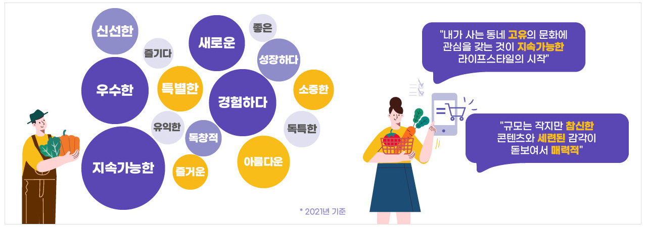 트렌드란 소비와 직결되는 생활양식이기에 대체로 돈의 흐름을 파악한 데이터보다 확실한 근거는 없을 것이다. 구체적으로 올해 1월 19일 신한카드 빅데이터연구소에서 신용카드 이용자들의 카드 소비 데이터를 분석해 발표한 트렌드 리포트 ‘2022년의 소비 트렌드 주요 키워드’ 여섯 가지 중 하나로 로코노미를 내세운 것도 주목할만하다. 신한카드 이용건수 기준으로 매년 1월부터 9월 사이 지역별로 고유한 개성을 가진 매장을 대상으로 이용 변화를 살펴보니 2020년에 비해 2021년에 소비 지표가 상승한 것으로 나타났고, 그러한 소비 패턴이 트렌드에 민감하다고 여겨지는 청년층 이외 세대까지 폭넓게 적용된다고 분석할 수 있다.