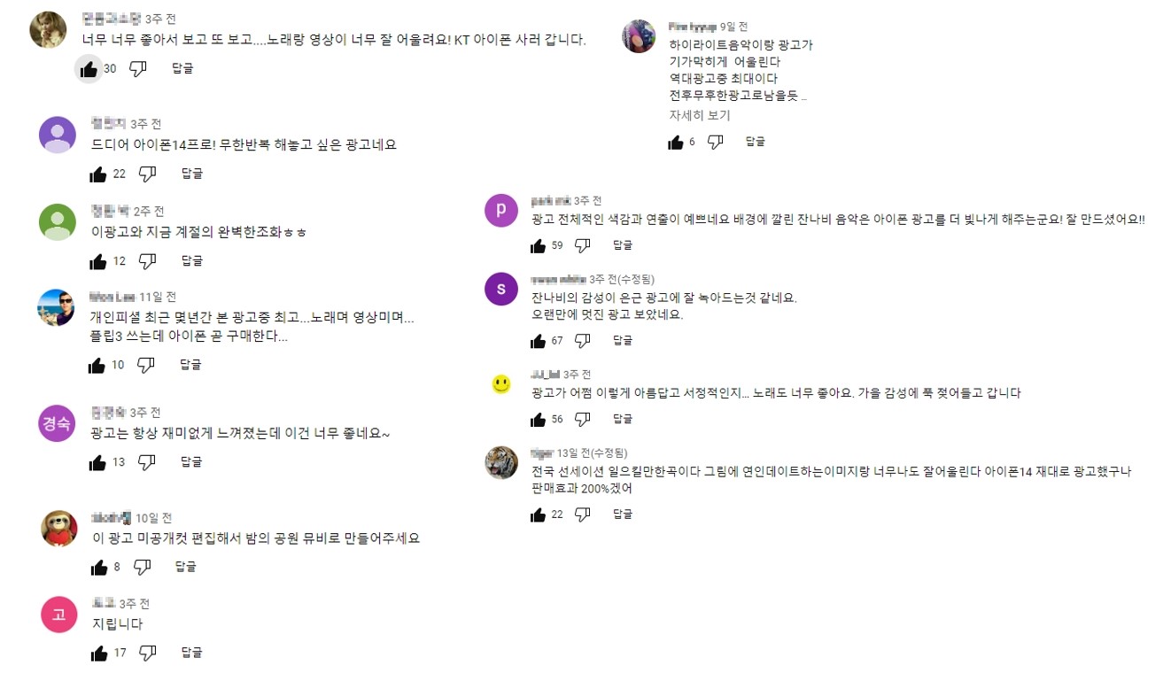 광고를 만들며 가장 기쁜 순간은 보는 사람들과 통했다는 느낌을 받을 때입니다. 이번 광고를 본 분들이 유튜브 댓글이나 SNS 게시글로 남기는 내용을 보면 제작하며 좋았던 부분, 꼭 남기고 싶었던 인상에 대해 공감해주고 있는 것 같아 기쁘고 뿌듯합니다.