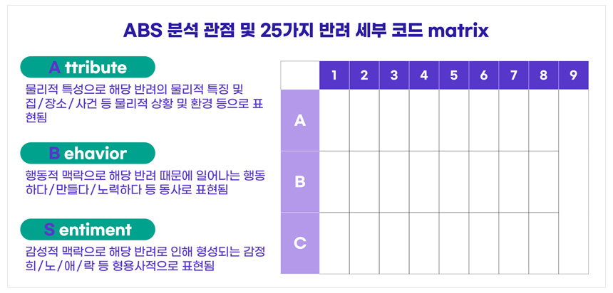 각 ‘관계’별 소셜 데이터를 통해 분석 관점을 3가지로 분류할 수 있다. 첫 번째는 물리적 특성(Attribute)이다. 해당 반려 대상만이 가지고 있는, 말 그대로 물리적인 특성으로 앞서 언급한 ‘인간 같은 생명체, 집, 무생물’을 들 수 있다. 두 번째는 파생 행동(Behavior)이다. 반려 대상과 함께 할 수 있는 활동, 반려 대상을 대하는 태도를 묶었다. ‘생명 유지 활동, 이름 붙여주기, 꾸미기’가 파생 활동에 해당한다. 마지막으로 심리 및 감성(Sentiment)이다. 반려 대상을 통해 느낄 수 있는 정서, 감정들을 분석했다. 의미론적으로 분류한 9개의 반려 관계는 이러한 3가지 관점, 즉 ABS(Attribute, Behavior, Sentiment) 측면에서 구조화해 반려를 재발견하는 25가지 시크릿 코드를 추출했다.