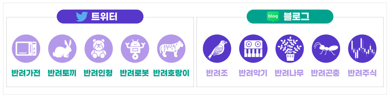 트위터에서 가장 자주 언급되는 반려 대상은 반려가전, 반려토끼, 반려인형, 반려로봇, 반려호랑이 등이다. 블로그에서 특이하게 언급되는 반려는 반려조, 반려악기, 반려나무, 반려곤충, 반려주식 등이다. 사람들은 ‘반려’라는 개념에 동물뿐만 아니라 종이 조각, 가구와 같은 무생물, 그리고 가상 캐릭터와 같은 상상의 영역까지 포함한 대상을 붙여 부르고 있다. 낯설고 생소한 반려들은 이미 소셜 공간에서 다양하게 언급되며 언어와 문화, 유행과 유희가 버무려져 독특하게 변형, 확산되고 있다.