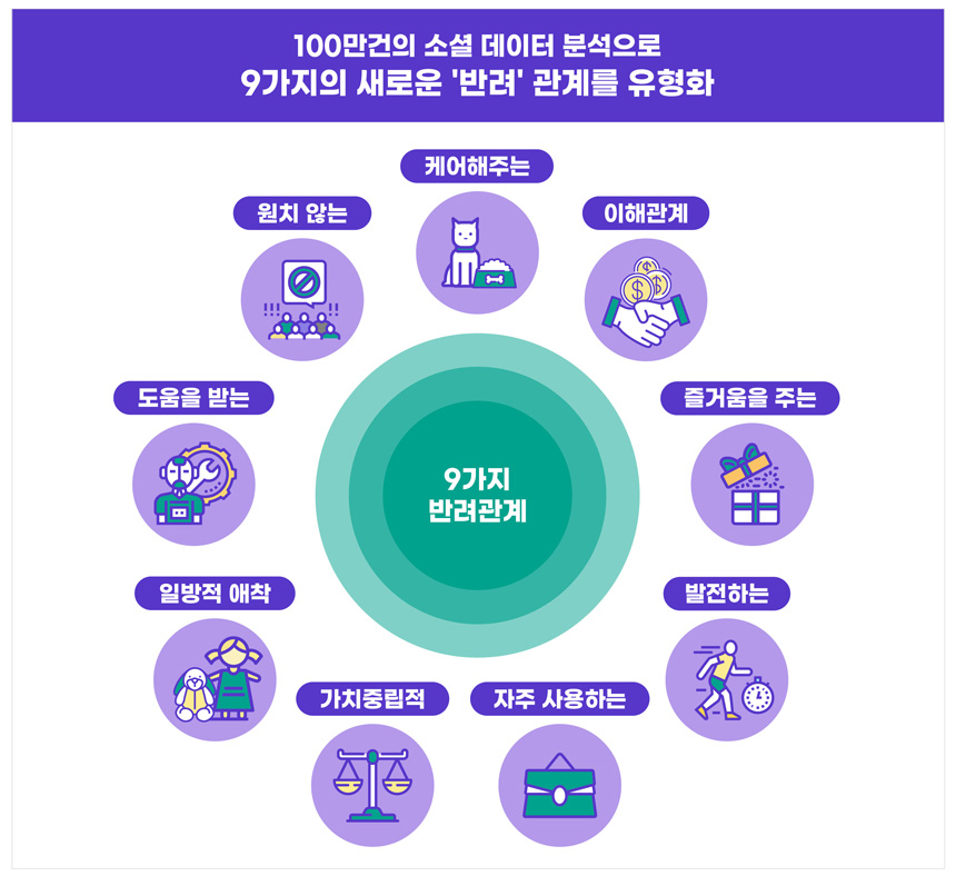 대홍기획은 소셜상에서 언급되는 반려의 맥락과 내포된 심리를 분석하기 위해 단순히 물리적인 기준이 아닌 의미론적 기준으로 800여 개에 달하는 반려를 분류했다. 그 결과 반려 대상을 총 9가지 관계 유형으로 정의할 수 있었다.