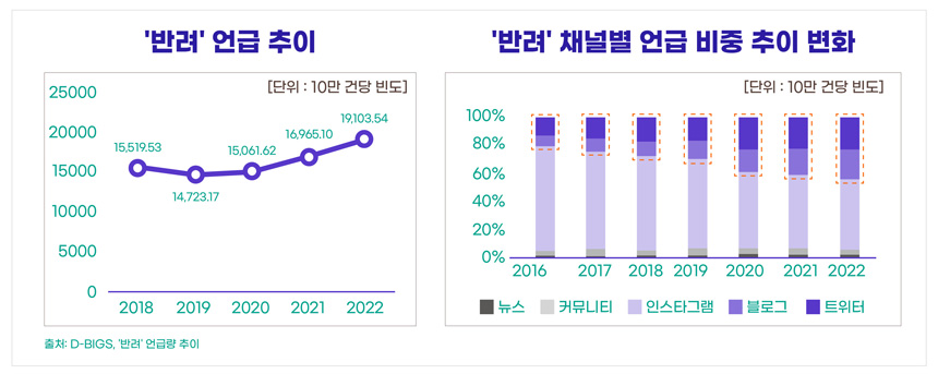 최근 5년간의 소셜 빅데이터를 살펴보면 ‘반려’에 대한 언급량이 코로나19 확산 이후 지속적으로 증가함을 알 수 있다. 채널별 비중도 달라졌다. 코로나 이전에는 반려견, 반려묘의 사진을 올리는 인스타그램의 비중이 높았지만, 코로나 이후 트위터나 블로그 등의 비중이 증가하며 다양한 형태의 ‘반려 대상’이 언급되기 시작했다.