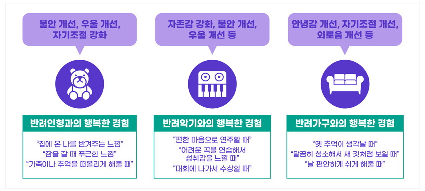 이들은 과연 찰나의 유행어로 스쳐 지나가는 현상일까? 소셜 공간에서는 반려 대상을 가벼운 장난이나 농담처럼 언급하기도 하지만 본인의 생각이나 고충을 진지하게 이야기하는 등 심리적으로 의지하는 관계에서 나타나는 행동을 보이기도 한다. ‘반려’에 대한 언급은 소셜상의 단순한 언어유희만은 아니다. 대홍기획의 조사에 따르면 사람들은 현실에서도 새로운 반려 대상과 친밀한 관계를 맺고 단순히 돌보거나 제품을 이용하는 것 이상의 풍부한 정서적 경험을 하며, 이를 통해 우울, 외로움 개선 등 심리적 이득을 취하는 것으로 나타났다. 이를 통해 소셜상 언급된 ‘반려’는 단순한 밈이나 표현이 아닌 밀착된 관계에 기반하는 의미 있는 현상임을 알 수 있다.