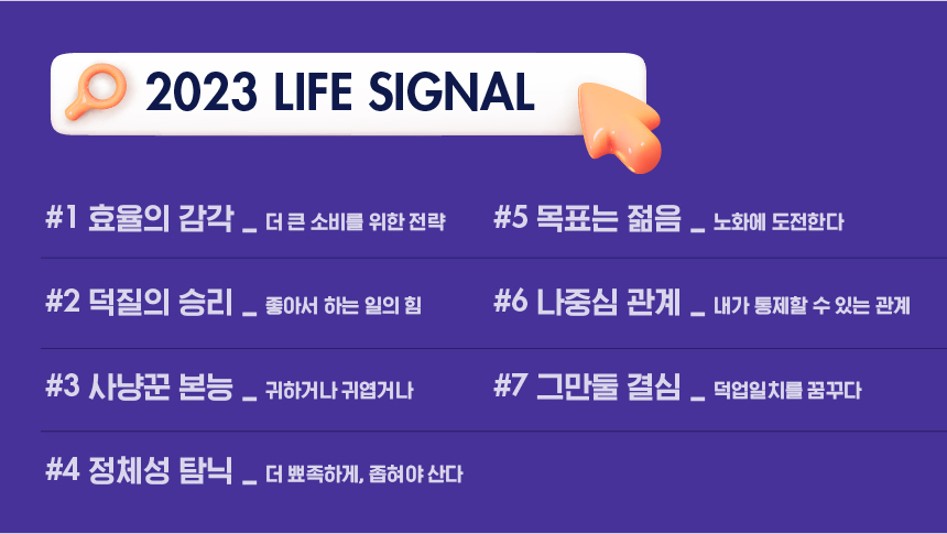 이처럼 소셜빅데이터 분석과 소비자 조사를 기반으로 그 외 검색, 결제, 구매 데이터 등을 활용해 내년도 소비 트렌드를 전망한 D.라이프.시그널(D.LIFE.SIGNAL) 리포트는 <2023년 소비를 이끄는 7개의 라이프 시그널>로 ▶ 효율의 감각 ▶ 덕질의 승리 ▶ 사냥꾼 본능 ▶ 정체성 탐닉 ▶ 목표는 젊음 ▶ 나중심 관계 ▶ 그만둘 결심을 전망했으며 각 주요 내용은 다음과 같다.