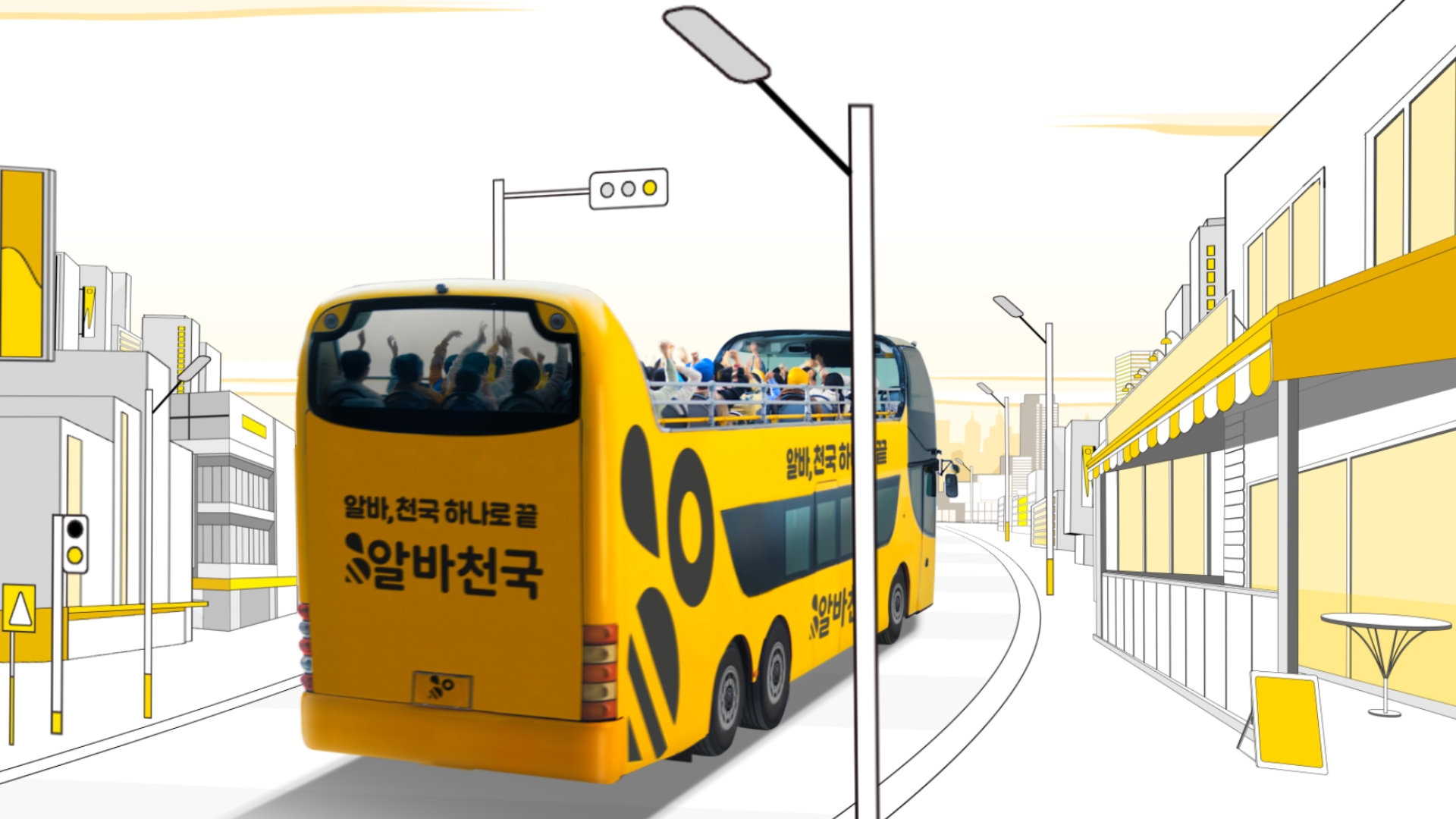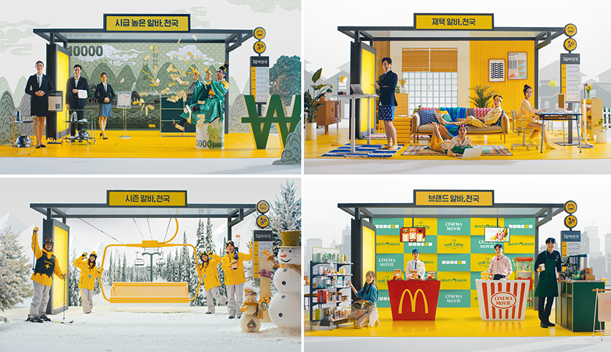 알바 정류장을 보다 실감 나게 구현하고자 모델 의상부터 작은 소품까지 심혈을 기울여 세팅했습니다. 덕분에 각 장소마다 디테일을 살펴보는 재미가 있습니다. 예를 들어 ‘재택 알바’ 씬에서 비대면 미팅을 위해 상반신은 격식을 차려입었지만 하의는 잠옷을 입은 알바생의 모습이 꼭 우리의 모습과 닮아 있어 공감 포인트가 되며 웃음을 유발합니다. 이번 캠페인 영상이 공개되고 색감 대비가 좋다는 호평도 많았습니다. 알바천국의 키 컬러인 노란색을 사용해 버스 랩핑부터 2D 배경까지 통일감을 줬기에 가능한 결과였습니다.