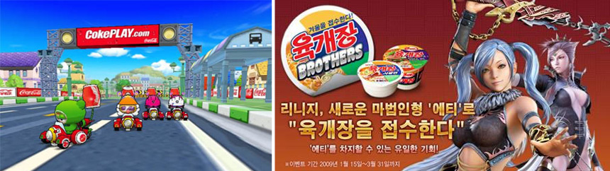 게임 콜라보 마케팅의 시작은 2000년대 초반으로 거슬러 올라간다. 당시에는 게임 이용자의 소비 성향이 높은 제품 중심으로 진행됐다. 2005년 넥슨의 레이싱 게임 ‘카트라이더’와 코카콜라의 콜라보가 시초 격으로 여겨진다. 카트라이더 게임 내에서 코카콜라 레이싱 대회가 열렸고 코카콜라 카트(차량)와 풍선 등 아이템도 지급됐다. 엔씨소프트의 ‘리니지’도 2009년 농심 라면 육개장과 공동 프로모션을 진행했다. PC방에서 판매하는 제품의 실적을 올리는데 주력하는 일차원적인 마케팅이 주를 이뤘던 셈이다. 이밖에 오직 제품 홍보만을 위해 제작된 ‘애드버게임(Adver-Game)’이 반짝 흥행했으나, 반복적이고 노골적인 메시지 노출로 인한 소비자 반발과 재미 부족을 이유로 사라졌다.