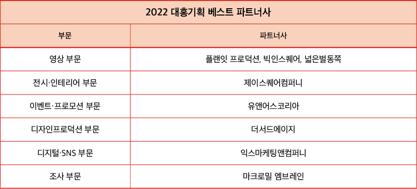 대홍기획이 2022년 우수 파트너사를 선정해 시상하는 <2022 대홍기획 베스트 파트너사 시상식>을 개최했다. 지난 한 해 동안 협업한 우수 파트너사에 감사의 마음을 전하는 상으로 6개 부문 8개 파트너사에 감사패와 상금 200만 원이 전달됐다.