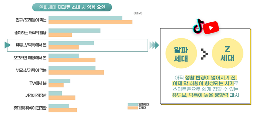 또 알파세대의 식음료 소비에서 놀라운 점은 유튜브/틱톡의 영향력이 다른 세대보다 크다는 것이다. 제과류 소비 시 ‘유튜브/틱톡에서 본 제품을 소비한다’는 응답이 알파세대 35%로 Z세대(25.5%)와 꽤 많은 차이를 보였다. 틱톡과 유튜브를 손에서 놓지 않을 듯한 Z세대보다 알파세대가 제과류 소비에 유튜브/틱톡의 영향을 더 많이 받는 것이다. 이는 알파세대의 생활반경이 아직 넓어지기 전이고, 취향도 형성되는 시기기 때문에 스마트폰으로 쉽게 접할 수 있는 유튜브/틱톡이 이들의 소비에 영향을 크게 준다 할 수 있겠다.