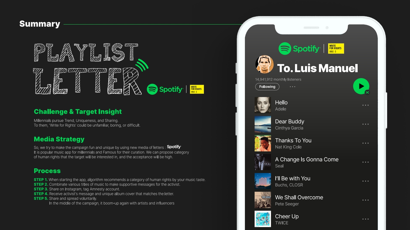 영 라이언즈 컴피티션은 만 30세 이하의 젊은 크리에이터를 대상으로 프랑스 칸에서 1박 2일 동안 진행되는 경연으로 이번 한국 대표 선발대회에서 Gold를 수상한 5개 팀에게 참가 자격이 주어진다. 송서율, 김현 CⓔM은 국제앰네스티와 스포티파이의 <Playlist Letter>로 Media 부문 Gold를 수상했다. 칸 라이언즈 페스티벌은 오는 6월 19일부터 23일까지 프랑스 칸에서 진행된다.