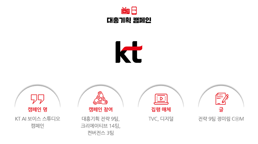 디지털 시대의 광고 크리에이티브는 어때야 할까요? KT는 더 재미있고 자극적인 ‘화법’에 집중되고 있는 지금의 방식에서 나아가, Voice의 주체를 바꾸고 프로세스는 효율화한 ‘제작 방식의 디지털화’를 고민하고 있습니다. 디지털상의 성공적인 성과에 힘입어 현재 TVC로도 집행되고 있는 파비앙의 사례가 좋은 예시입니다. 앞으로도 디지털 시대에 살아남기 위한 KT의 체질 개선은 계속됩니다. 기대해주세요!