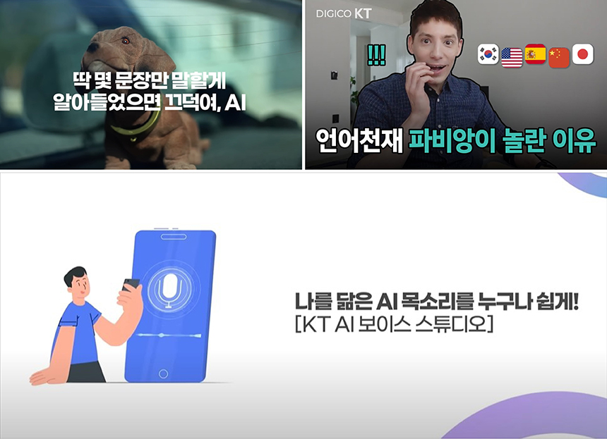 첫 번째 사례는 외국인 유튜버 파비앙과 함께 했습니다. 내 목소리를 AI 보이스화해 쉽고 유용하게 사용 가능하며, 한국어뿐만 아니라 5개 국어로 발화가 가능한 ‘AI 보이스 스튜디오’를 홍보하기 위함이었습니다. ‘글로벌 역량’을 메인 소구 포인트로 설정하고, 이를 가장 잘 담아낼 수 있는 유튜버를 고르는 것이 우선이었습니다. 다음으로 파비앙과 만든 마더 콘텐츠를 바탕으로 장면과 멘트를 취사 선택하고 광고적 편집감과 카피라이팅을 더해 KT만의 광고를 만들었습니다. 그렇게 하나의 소스에서 총 8개의 광고 영상이 탄생할 수 있었습니다.