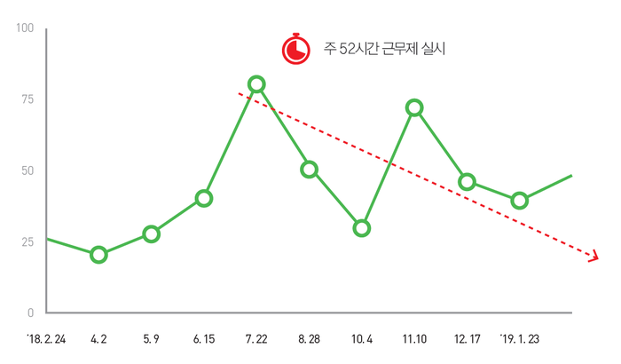 바깥의 ‘맛집’을 찾아 검색하는 횟수도 2018년 7월 이후로 점점 줄고 있다. 2018년 7월은 바로 주 52시간 근무제가 본격 실시된 시기. 외부에서 진행되던 여러 활동이 집 안으로 들어오게 된 주요 원인이다.