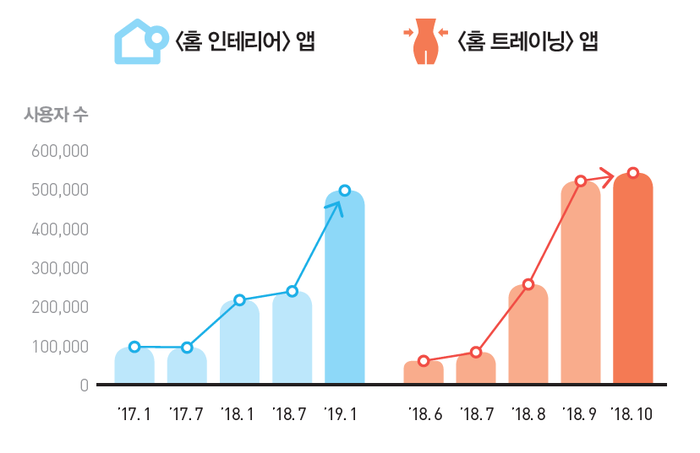 집안 체류 시간 증가는 ‘집안 소비 다양화’를 부추기게 된다. 주 52시간제 이후 <홈 트레이닝> 앱, <홈 인리테어> 앱 사용자가 두드러지게 증가했다.