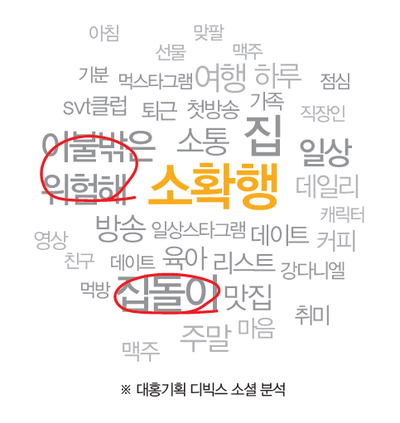 2018년의 키워드 중 하나인 소/확/행. 사소한 행동을 통해서도 자존과 다양성이 있는 삶을 지키는 것. ‘소확행’ 연관어로 <이불 밖은 위험해>, <집돌이>, <집> 등이 눈에 띈다. 오롯이 나만을 위한 공간으로서의 ‘집’, 그 안에서 누리는 작은 사치를 소확행과 연결하고 있는 현상이다.