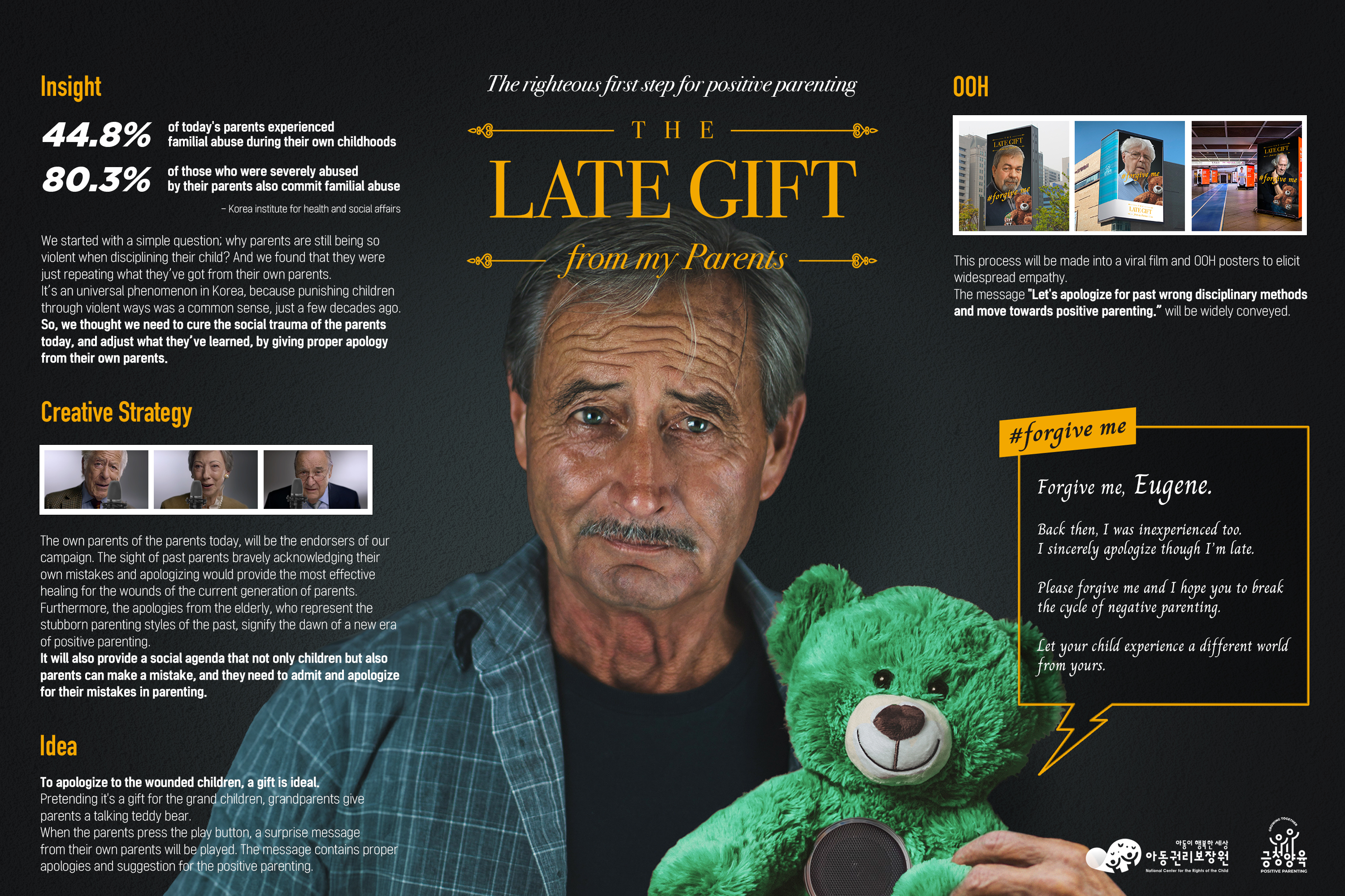 치열한 경쟁 끝에 대홍기획 이원정, 김승현 CⓔM이 한국팀 중 유일하게 크리스탈 상을 차지했다. 수상작 <Late Gift>는 아동권리보장원 긍정양육과 함께하는 캠페인으로, 자녀에게 사과의 메시지를 전하는 테디베어를 통해 대물림되고 있는 가정 학대를 근절하자는 아이디어다.