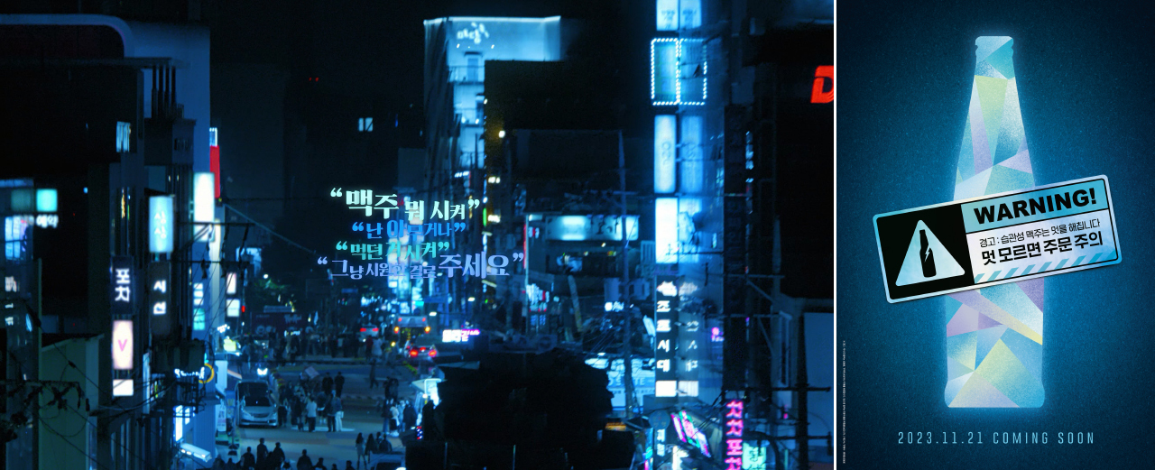 새로운 세대의 맥주를 보여주기 위해 맥주 광고의 공식과도 같았던 원산지, 기법, 맛, 정통성을 과감하게 버리고, 우리 타깃이 보고 듣고 싶은 것만 광고에 담았습니다. 시끌벅적하고 요란한 술집이 아니라, 정서적 안정감을 주는 나만의 아지트 같은 옥상을 표현했고, 블루 라이트 대형 간판을 설치해 KRUSH의 등장을 임팩트 있게 보여줬습니다. 그밖에 술집의 대형 금붕어 어항, 천장의 환풍기, 옥상 연결통로의 낙서와 빈티지 소파 등 크러시만의 감성을 담기 위해 모든 디테일을 계산해 표현했습니다.