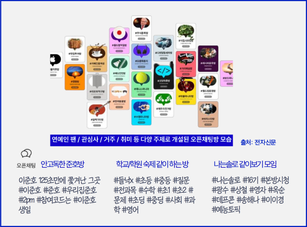 그래서 운동, 게임, 덕질, 절약, 스터디, 음악 등 관심사가 같은 사람들이 모일 수 있는 공간으로 카카오톡 오픈채팅이 주목받고 있다. 익명게시판 기반 커뮤니티 문화가 채팅으로 옮겨가면서 오픈채팅방이 활성화된다는 분석도 있다. 카카오톡 오픈채팅방 탭에서 검색해 보면 정말 다양한 관심사가 존재한다는 걸 확인할 수 있다. 이 안에서는 익명으로 자신의 신상 정보를 공개하지 않는 것이 원칙이며, 채팅방 테마에 해당하지 않는 대화도 엄격하게 금지된다. 혼자 있어도 연결, 함께 있어도 혼자이길 원하는 사람들에게 오픈채팅은 목적에 맞게 효율적으로 연결됐다가도 원할 때는 바로 ‘나가기’를 누를 수 있는 최적의 플랫폼이다. 이에 카카오는 지난 5월 중순 ‘오픈채팅 Lite’를 선보였다. 카카오는 오픈채팅을 향후 사업의 중요한 키(key)로 간주하고 있다.