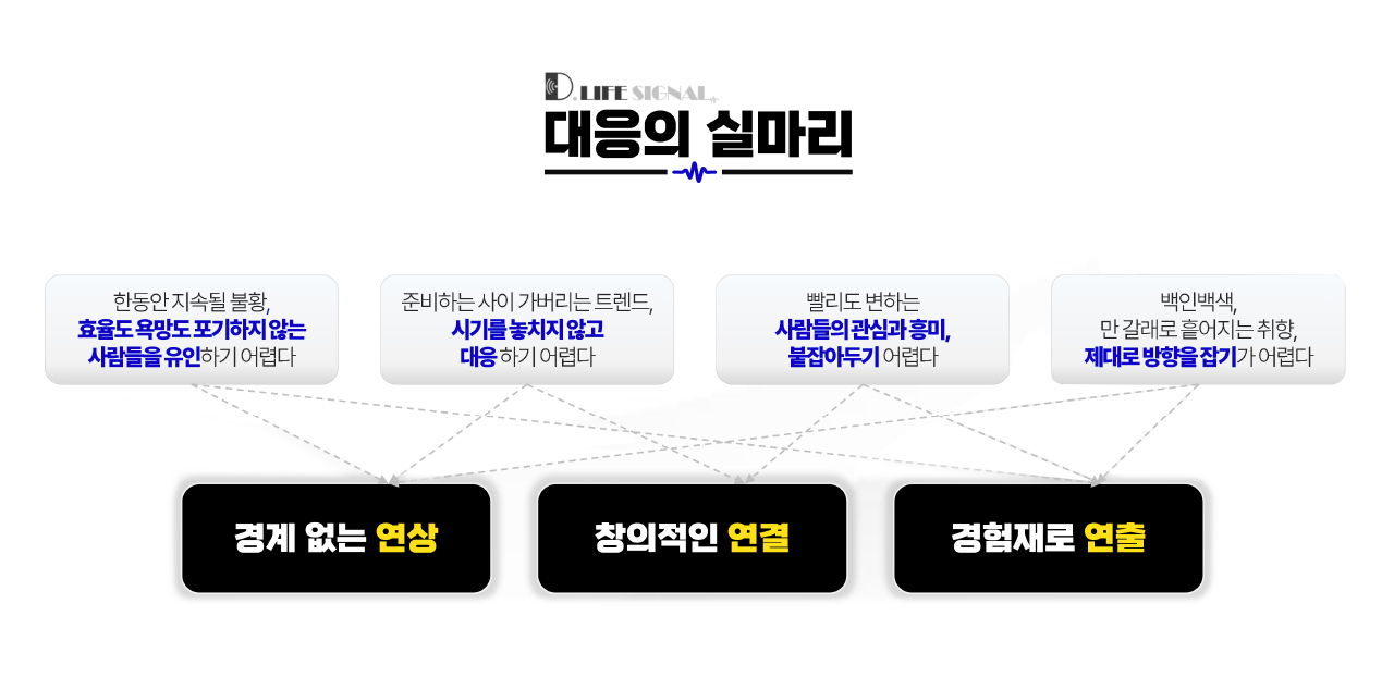 경제감각, 선호형성, 관계운용, 구매방식, 기술수용의 5개 차원에서 양극단으로 벌어지는 현상의 시그널들. 우리는 이를 ‘모순의 일상화’라고 정의했다. 이처럼 종잡을 수 없이 극단적으로 전개되는 상황에서 기업과 브랜드는 여러 어려움에 직면한다. 한동안 지속될 불황 속에 효율도 욕망도 포기하지 않는 사람들을 유인하기 어렵다. 변화가 워낙 빠르다 보니 준비하는 사이에 이미 시기를 놓쳐 대응하기 어렵다. 사람들의 관심과 흥미 또한 워낙 빠르게 변해 붙잡아 두기가 어렵다. 백인백색, 만 갈래로 취향이 흩어져 제대로 방향을 잡기가 어렵다. 이런 세태에 기업은, 브랜드는 어떻게 접근하고 대응해야 할까?