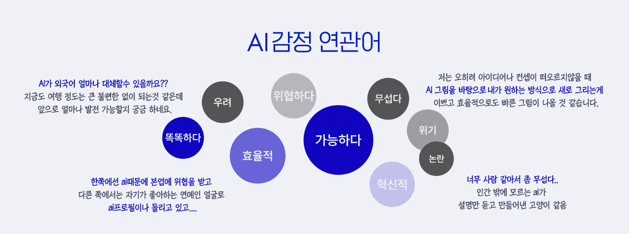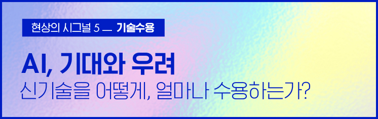 한편 대화형 생성 AI가 등장하며 사람들이 직접 AI를 경험하게 되니 AI에 대한 관심이나 기대도 이전과는 사뭇 다르다. 73%의 사람들이 챗GPT에 관심이 있다고 응답했고, 58%는 챗GPT로 인한 변화가 긍정적일 것으로 기대한다고 응답했다. 그러나 AI의 획기적인 성능을 체험하면서 이로 인해 위협받을 인간적 가치에 대한 막연한 우려도 공존한다. 그 막연한 우려의 핵심은 역시 AI가 사람의 역할을 대체할 수도 있다는 두려움이다. 할리우드에서 발발한 북미 예술계 배우들의 파업 사태는 그러한 두려움의 날 선 표출로 보인다.