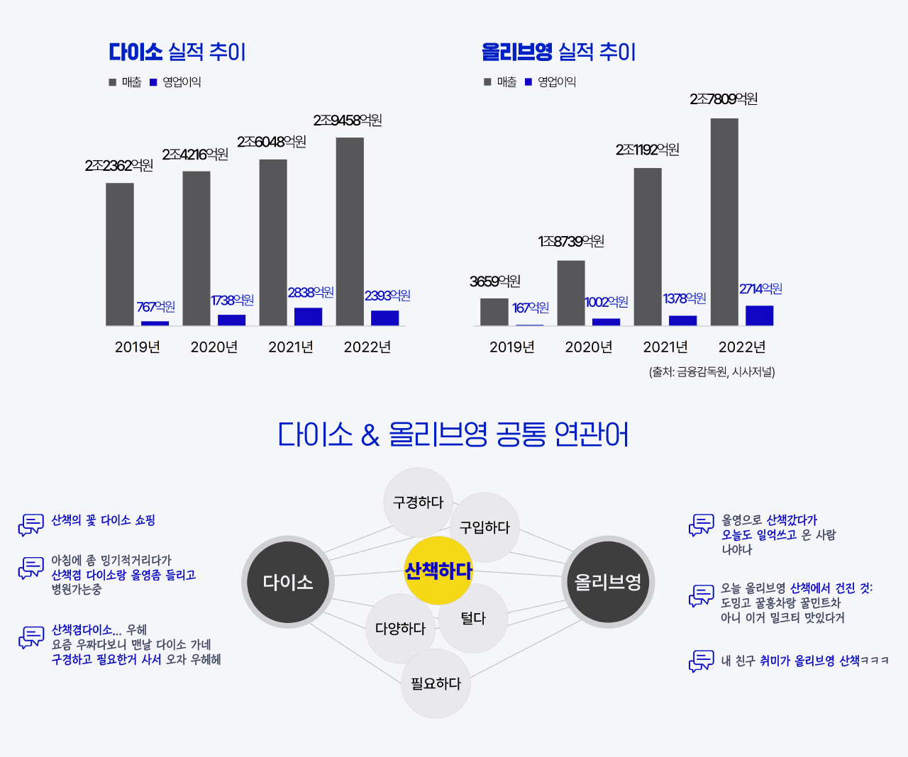 그런 면에서 주목할 만한 오프라인 리테일이 있다면 역시 다이소와 올리브영이다. 두 업체는 나란히 연 매출 3조를 바라보고 있다. 다이소는 ‘MZ들의 놀이터’로 떠오르더니 불황을 맞아 날개를 달았고 올리브영은 H&B 시장을 평정했다. 그런데 다이소와 올리브영을 소셜데이터로 살펴보면 재미있는 공통점이 있다. ‘구경하다’, ‘털다’, ‘산책하다’ 등이 공통 연관어로 나타나는 것이다. 목적 없이 구경하다가 나도 모르게 이것저것 털어오게 되는 곳, 결국 발견형 쇼핑을 만족시키는 오프라인 리테일의 조건이란 목적 없이 ‘산책하듯 둘러보다가 발견하는 기쁨을 주는’ 것이 포인트다.