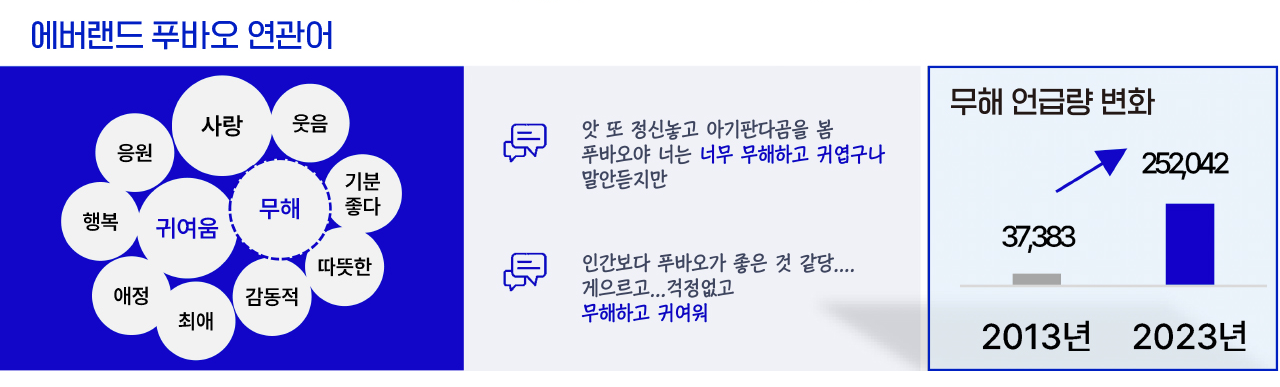 푸바오에 대한 사람들의 언급 내용을 분석해 보면 가장 중심에 있는 ‘귀여움’과 빈번하게 언급되는 ‘무해함’이라는 감성을 관찰할 수 있다. 무해함, 사전적 의미로는 ‘해롭지 않다’는 의미일 뿐인데 여기엔 귀여움을 넘어서는 다른 감성이 내포돼 있다. 무해함의 포인트는 부드러운 털이나 동그랗고 귀여운 얼굴이 아니다. 풀이하자면 무해함이란 경쟁과 자극이 상존하는 세상에서 꼬인 데나 앞뒤 계산 없이 단순하며, 뛰어나진 않지만 불만 없이 평온하고 선량한 성격, 천진하고 순수한 언행이나 태도 같은 것으로 결국 상대방을 무장해제시키는 힘을 가리킨다. 그렇게 ‘귀여움’의 감성에 ‘무해함’이 결합되면 사람들이 열광하는 평화롭고 공격성이 없으며 악의 없이 순수하다는 의미가 비로소 완전해진다. 귀여움과 무해함에 무장해제된 사람들은 기꺼이 지갑을 열고 있다.