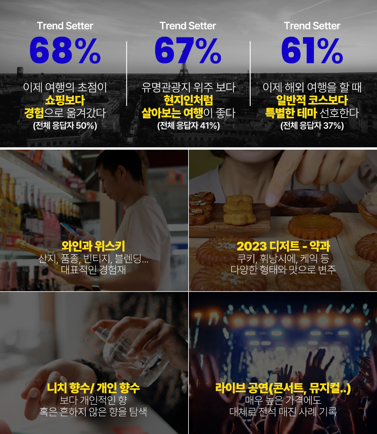 그러나 아무리 어려워도 사람들은 초저가, 불황형 소비에만 급급하지는 않다. 과감한 소비 지향적 문화가 번지면서도 가성비 소비가 덩달아 늘어나는 모순적 현상, 불황기 소비의 특징은 ‘편향 소비’다. 호캉스를 즐기면서도 편의점에서 저렴하게 먹거리를 해결하는 행태 덕분에 호텔에 입점한 편의점 매출이 크게 늘었다는 사례가 대표적이다. 이러한 편향 소비의 경향을 두드러지게 확인할 수 있는 것이 여행 지출이다. 2023년 상반기 신용카드 지출액에서 여행 지출의 증가율이 가장 높았다. 여행의 니즈 또한 ‘도장깨기’식 섭렵에서 다채롭고 깊은 경험을 지향하는 방향으로 진화 중이다.