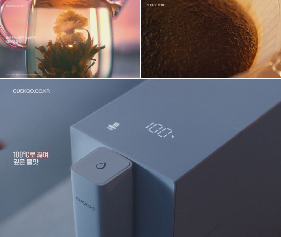 다만 광고에서 커피만 강조되면 정수기가 아닌 커피머신으로 오해할 수 있어 정수기 제품의 기본 속성인 물맛에 대한 표현까지 모두 광고에 담아야 하는 고민이 있었습니다. 그래서 한 편에 모든 것을 담기보다는 두 가지 장점을 가장 잘 표현할 수 있도록 멀티 편으로 광고를 제작했습니다. 모델인 가수 이준호 씨를 통해 100도씨 끓인 물로 드립커피가 내려지는 모습을 표현한 Drip 편과 100도씨 물에서만 피어나는 꽃차를 활용한 Tea 편으로 쿠쿠 스팀100 바리스타 정수기를 선보였습니다.