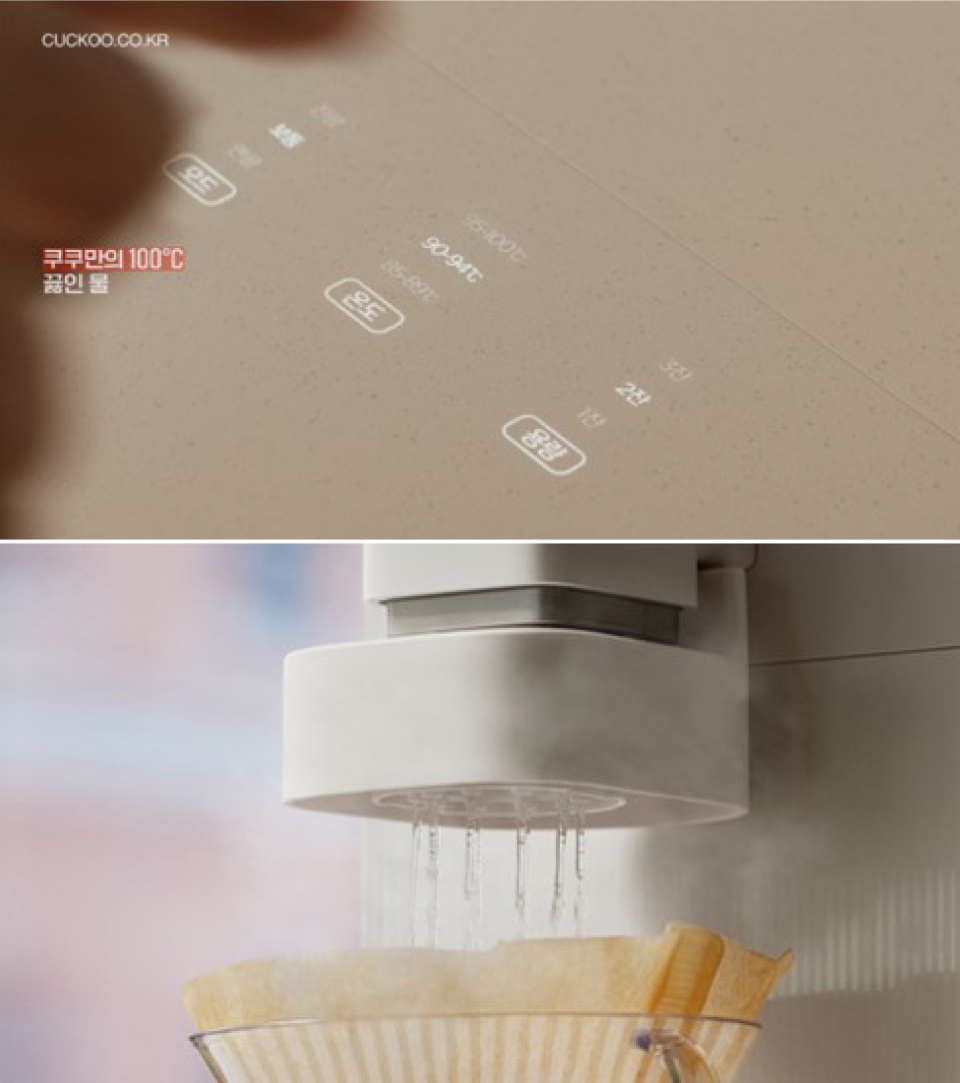 특히 이번 신제품을 통해 새롭게 선보이는 기술은 진짜 100도씨 끓인 물이 아니면 불가능한 정수기와 드립커피 모드의 만남입니다. 지금의 대한민국 소비자들은 365일 커피를 즐기는, 커피 전문가이자 진심인 사람들입니다. 이들을 위해 쿠쿠는 세상에 없던 정수기를 만들어냈습니다. 자체 기술력으로 제작한 드립 키트를 정수기에 장착하면 드립커피 모드로 자동 변환돼 유속과 유량을 설정할 수 있습니다. 더 편리하고 퀄리티 높은 커피를 맛볼 수 있게 되죠. 이를 통해 소비자들은 쿠쿠의 앞선 기술력을 더 직접적으로 체감할 수 있습니다.