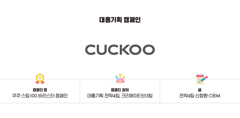 국내 최초, 100도씨 끓인 물 정수기로 시장에 새로운 기준을 만든 쿠쿠 정수기. 올해 또 한 번 혁신적인 기능으로 ‘쿠쿠 스팀100 바리스타 정수기’ 캠페인을 진행했습니다. 차별화된 편리함과 함께 본질적인 맛까지 빼놓지 않은 제품으로 이번 캠페인을 통해 100도씨 끓인 물 정수기의 대표 브랜드로 입지를 강화해냈습니다.