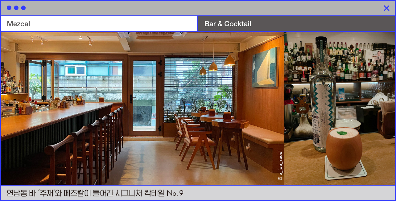 데킬라처럼 소금이나 오렌지 등을 곁들여 스트레이트로 먹을 수도 있지만 입문자라면 메즈칼 특유의 맛과 향을 살린 칵테일로 즐기면 더욱 좋다. 연남동 바 ‘주재’에서는 메즈칼의 스모키함을 살린 다양한 칵테일을 선보인다. 데룸베스 메즈칼 베이스에 당근과 시나몬, 크림을 재료로 한 시그니처 칵테일 No. 9을 추천한다. 2024 새해에는 새 술로, ¡Salud!