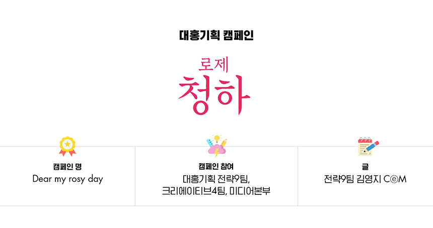 청하 스파클링이 가진 ‘부담 없이 가볍게 특별한 분위기를 만드는’이라는 핵심 아이덴티티는 강화하되, 별빛청하와는 전혀 다른 소구점이 필요했는데요. 고민은 로제청하만이 갖는 감성적 TPO 발굴에서 시작됐습니다. 제품 패키지만 봐도 별빛청하와는 전혀 다른 톤앤매너가 두드러집니다. 별빛청하에서 밤하늘 별빛이 보여졌다면 로제청하는 장밋빛 꽃잎이 흩날리고 있죠. 직관적 이미지 외에도 다양한 제품 속성을 분석했을 때 공통적으로 ‘설렘’이라는 감성 키워드를 도출할 수 있었습니다. 이를 통해 별빛청하는 평범한 오늘도 특별하게 기념하는 탄산주, 로제청하는 설레는 내일을 기대하게 하는 탄산주로 차별화된 포지셔닝을 이루고자 했습니다.