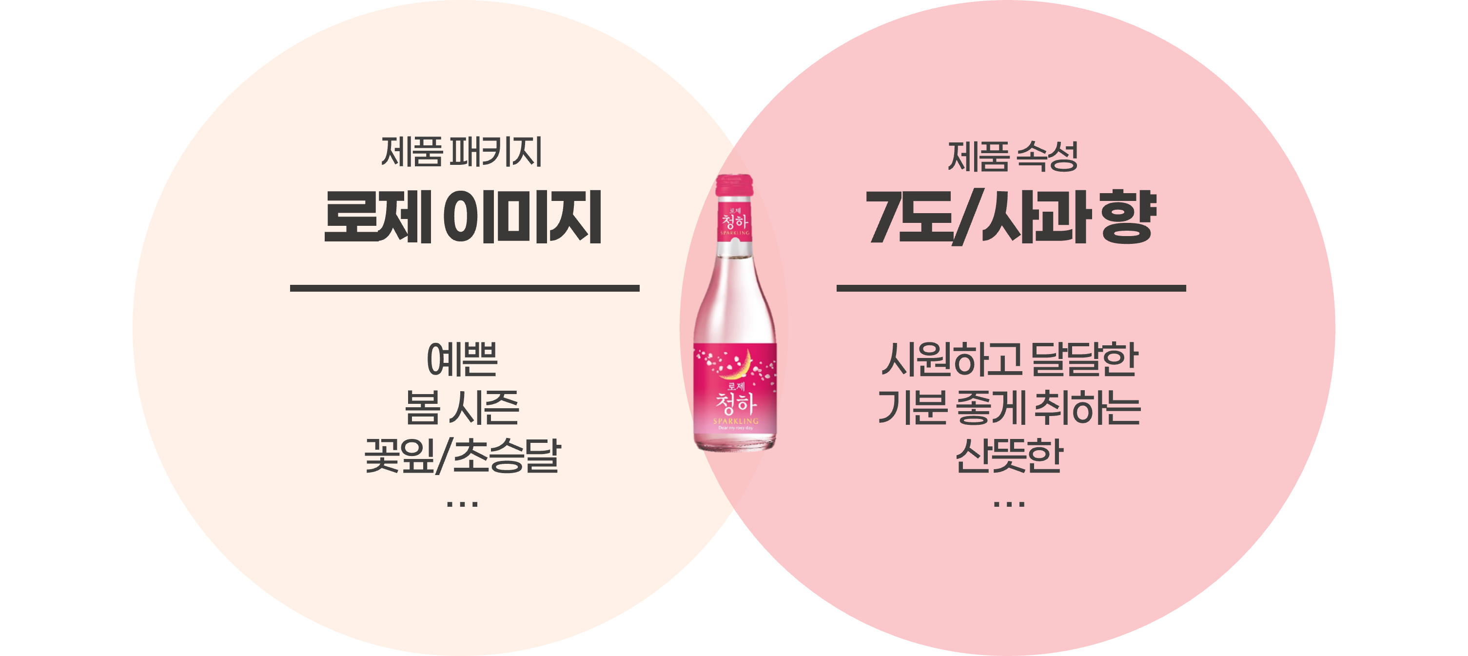 청하 스파클링이 가진 ‘부담 없이 가볍게 특별한 분위기를 만드는’이라는 핵심 아이덴티티는 강화하되, 별빛청하와는 전혀 다른 소구점이 필요했는데요. 고민은 로제청하만이 갖는 감성적 TPO 발굴에서 시작됐습니다. 제품 패키지만 봐도 별빛청하와는 전혀 다른 톤앤매너가 두드러집니다. 별빛청하에서 밤하늘 별빛이 보여졌다면 로제청하는 장밋빛 꽃잎이 흩날리고 있죠. 직관적 이미지 외에도 다양한 제품 속성을 분석했을 때 공통적으로 ‘설렘’이라는 감성 키워드를 도출할 수 있었습니다. 이를 통해 별빛청하는 평범한 오늘도 특별하게 기념하는 탄산주, 로제청하는 설레는 내일을 기대하게 하는 탄산주로 차별화된 포지셔닝을 이루고자 했습니다.
